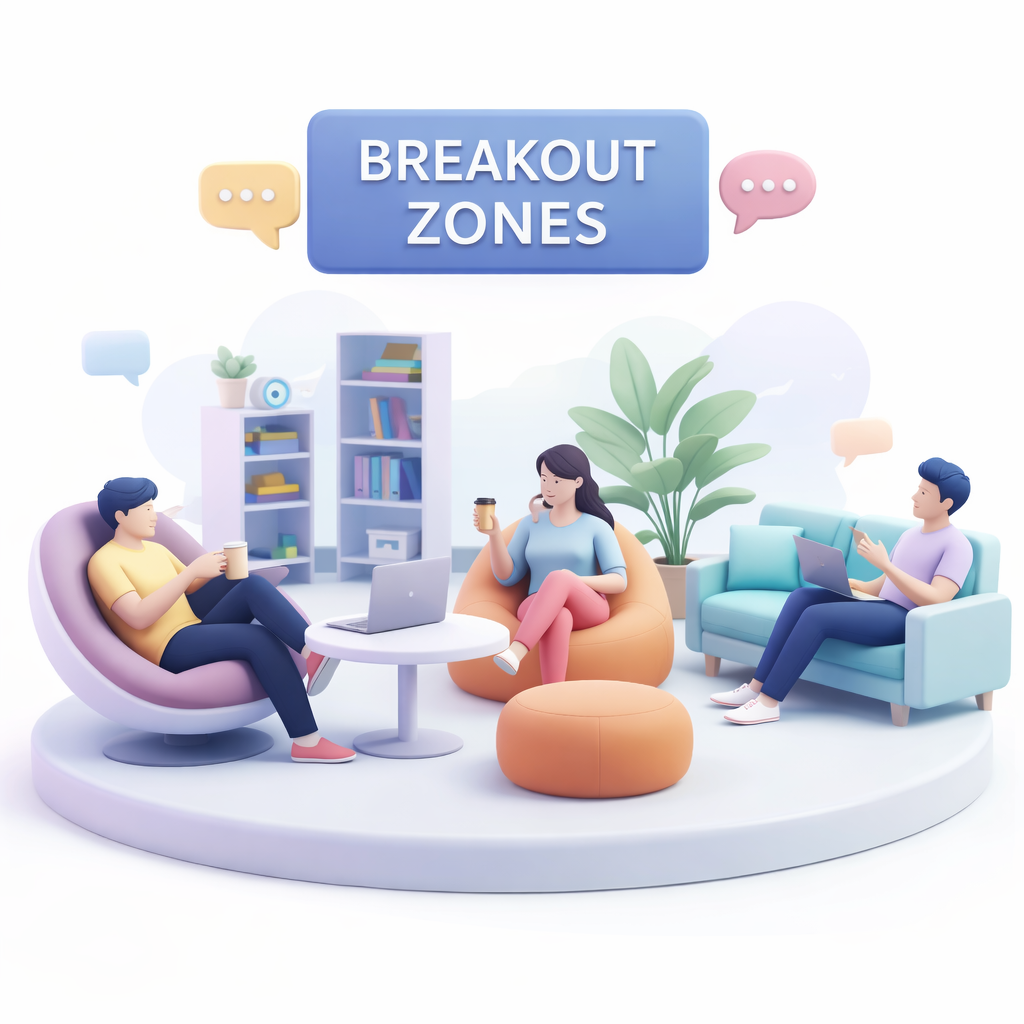 Spaces for relaxed collaboration, brainstorming, and quick team syncs.